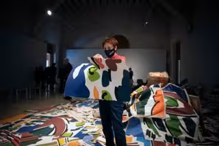 La sala Refectorio del Centre del Carme de Valncia ha acogido una particular muestra de estas obras, tiradas en el suelo y apoyadas en las paredes, que la propia artista y varios galeristas y amigos han pisado, rasgado y pintado.