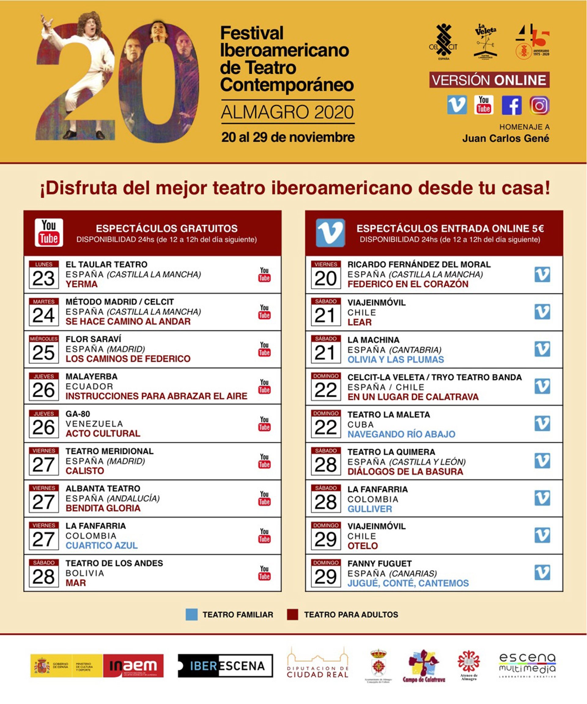Malayerba (Ecuador) con Instrucciones para abrazar el aire; Teatro De Los Andes (Bolivia) con Mar; La Machina Teatro (Cantabria) con Olivia y las plumas; La Quimera (Castilla y León) con Diálogos de la basura; Teatro Meridional (Madrid) con Calisto; Albanta (Andalucía) con Bendita Gloria; Grupo Actoral 80 (Venezuela) con Acto cultural; Viajeinmóvil (Chile) con Lear y Otelo, son algunos de los espectáculos que harán gala en esta edición especial de aniversario.