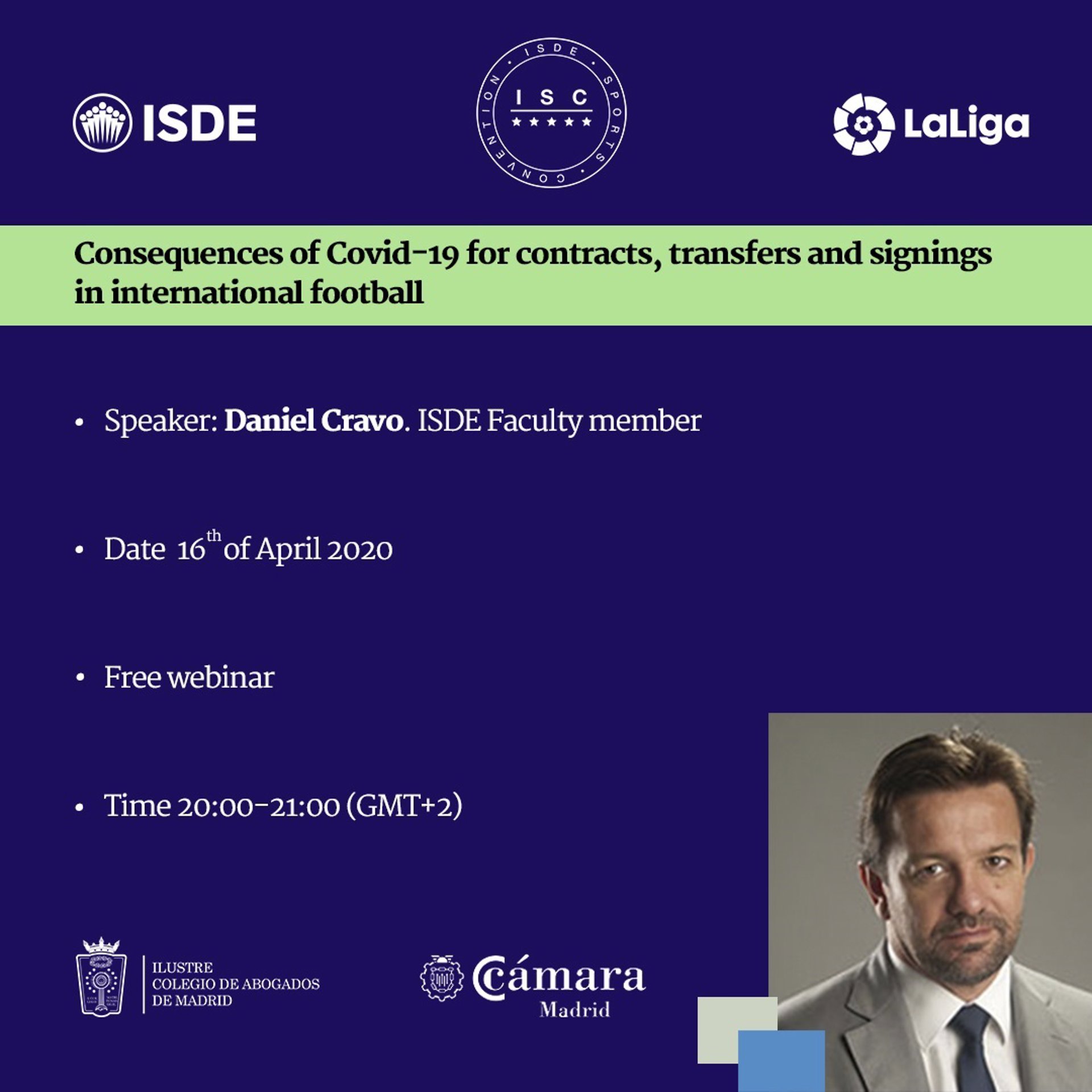 ISDE, en colaboración con LaLiga, el Colegio de Abogados de Madrid y la Cámara de Comercio de Madrid, organiza estos encuentros en el marco de actividades del ISDE Sports Convention (ISC) para analizar y debatir los asuntos de interés a raíz de la situación de crisis sanitaria y económica provocada por la pandemia global de la COVID-19.