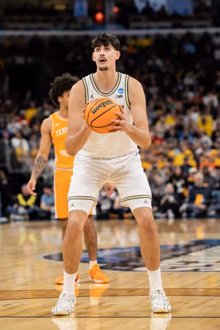 March 29, 2026, Chicago, Illinois, United States: Aday Mara of the Michigan Wolverines in action against the Tennessee Volunteers in the Elite Eight round of the NCAA Men's Basketball Tournament at the United Center. Final score; Michigan 95-62 Tennessee.
