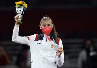 La taekwondista Adriana Cerezo posa con su medalla de plata en los Juegos Olímpicos de Tokyo 2020.