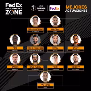 El Villarreal es el equipo que más jugadores aporta a la alineación publicada por la UEFA en base a los parámetros ofrecidos por la 'FedEx Performance Zone'. De hecho, la mitad de la defensa ideal pertenece al 'Submarino' con Albiol y Foyth. El argentino fue el jugador que más duelos ganó (25) en toda la competición y Albiol marcó dos goles y fue un seguro de vida para los castellonenses.