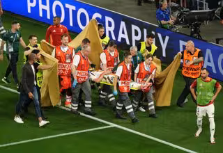 23 June 2024, Baden-Wuerttemberg, Stuttgart: Hungary's Barnabas Varga is taken from the pitch on a stretcher following a collision during the UEFA Euro 2024 group A soccer match between Scotland and Hungary at the MHPArena. Photo: Bradley Collyer/PA Wir - Bradley Collyer/PA Wire/dpa