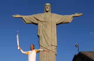 La exinternacional brasileña de voleibol Maria Isabel Barroso Salgado levantó la llama en la base de la gigantesca estatua de Cristo con los brazos extendidos, ubicada en lo alto de la bahía de Guanabara.
