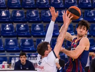 Leandro Bolmaro of Fc Barcelona in action against Jake Cohen of Monbus Obradoiro during the Liga Endesa ACB match between Fc Barcelona and Monbus Obradoiro at Palau Blaugrana on May 06, 2021 in Barcelona, Spain. - Javier Borrego/AFP7 / Europa Press