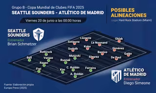 Sin aparentes bajas por problemas físicos en ninguna plantilla, Simeone no podrá contar con Clément Lenglet por sanción, en un Atleti en el que Antoine Griezmann busca poner fin a una racha de 17 encuentros sin ver puerta. En Seattle, Cristian Roldán es el jugador a seguir, clave en la faceta ofensiva de los locales esta madrugada.