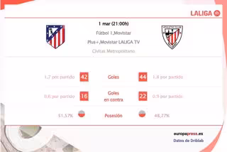 En total, de media, el Atlético de Madrid ha realizado 11,5 tiros por partido en lo que va de competición frente a 12,4 del Athletic Club. De ellos, 4,6 fueron entre los tres palos en el caso de ambos.