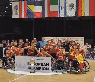 Los jugadores de la selección masculina de baloncesto en silla de ruedas celebran su oro en el Europeo  de Sarajevo 2025