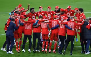 08 May 2021, Bavaria, Munich: Munich players celebrate winning the Bundesliga title after the final whistle of the German Bundesliga soccer match between Bayern Munich and Borussia Moenchengladbach at the Allianz Arena. Photo: Peter Kneffel/dpa-Pool/dpa - Peter Kneffel/dpa-Pool/dpa