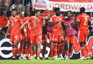 13 September 2022, Bavaria, Munich: Munich players celebrate scoring their side's second goal during the UEFAChampions League Group C soccer match between FC Bayern Munich and FC Barcelona at Allianz Arena. Photo: Peter Kneffel/dpa - Peter Kneffel/dpa