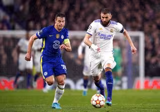 06 April 2022, United Kingdom, London: Chelsea's Cesar Azpilicueta (L) and Real Madrid's Karim Benzema battle for the ball during the UEFA Champions League quarter-final first leg soccer match between Chelsea and Real Madrid at Stamford Bridge. Photo: J - John Walton/PA Wire/dpa