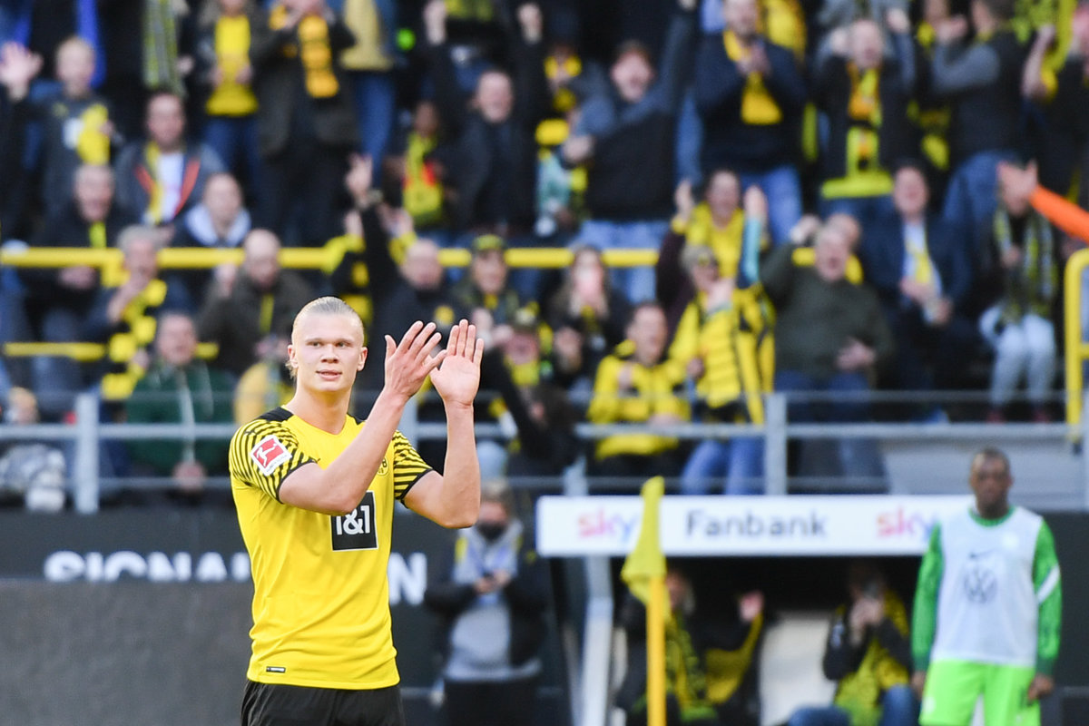 16 April 2022, North Rhine-Westphalia, Dortmund: Dortmund's Erling Haaland celebrates scoring his side's fifth goal during the German Bundesliga soccer match between Borussia Dortmund and VfL Wolfsburg at Signal Iduna Park. Photo: Bernd Thissen/dpa - IM - Bernd Thissen/dpa