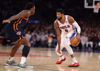 Archivo - El jugador de los Philadelphia 76ers Paul George frente al alero de los New York Knicks OG Anunoby durante un encuentro entre ambos equipos - AL BELLO (NBA) - Archivo