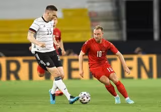 02 June 2021, Austria, Innsbruck: Germany's Niklas Suele (L) and Denmark's Christian Eriksen fight for the ball during the International Friendly soccer match between  Germany and Denmark at Tivoli Stadium. Photo: Christian Charisius/dpa
