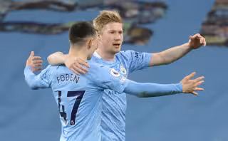 10 March 2021, United Kingdom, Manchester: Manchester City's Kevin De Bruyne (R) celebrates with Phil Foden after scoring their side's fifth goal during the English Premier League soccer match between Manchester City and Southampton at the Etihad Stadi - Clive Brunskill/PA Wire/dpa