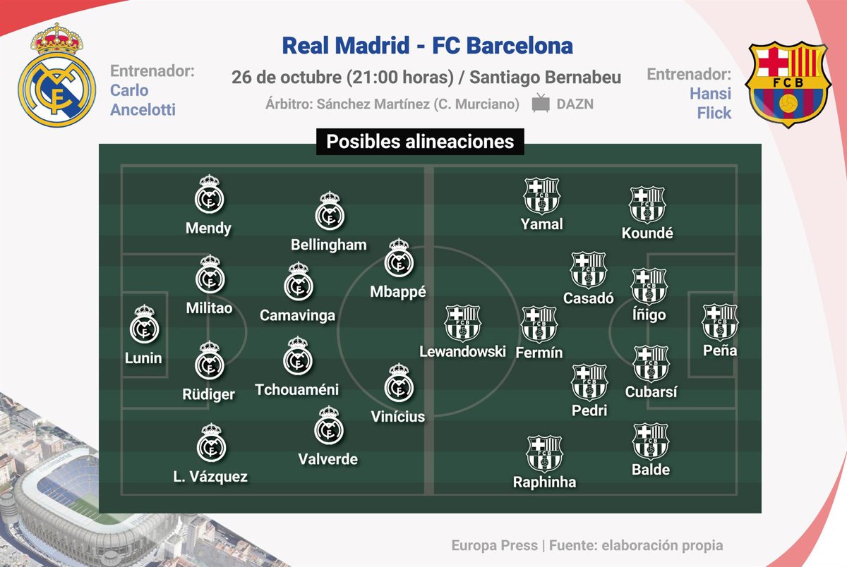Infografía con posibles alineaciones para el próximo partido Real Madrid - FC Barcelona que tendrá lugar el próximo 26 de octubre en el estadio Santiago Bernabeu. - Europa Press