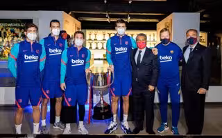 El trofeo ganado el pasado sábado, con el triunfo ante el Athletic Club (0-4) en La Cartuja, ha sido entregado por el presidente Laporta, junto al vicepresidente primero, Rafa Yuste, el entrenador del primer equipo, Ronald Koeman, y los cuatro capitanes; Leo Messi, Sergio Busquets, Gerard Piqué y Sergi Roberto.