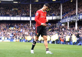 Archivo - 09 April 2022, United Kingdom, Liverpool: Manchester United's Cristiano Ronaldo assesses the cuts on his leg after the final whistle of the English Premier League soccer match between Everton and Manchester United at Goodison Park. Photo: Mart