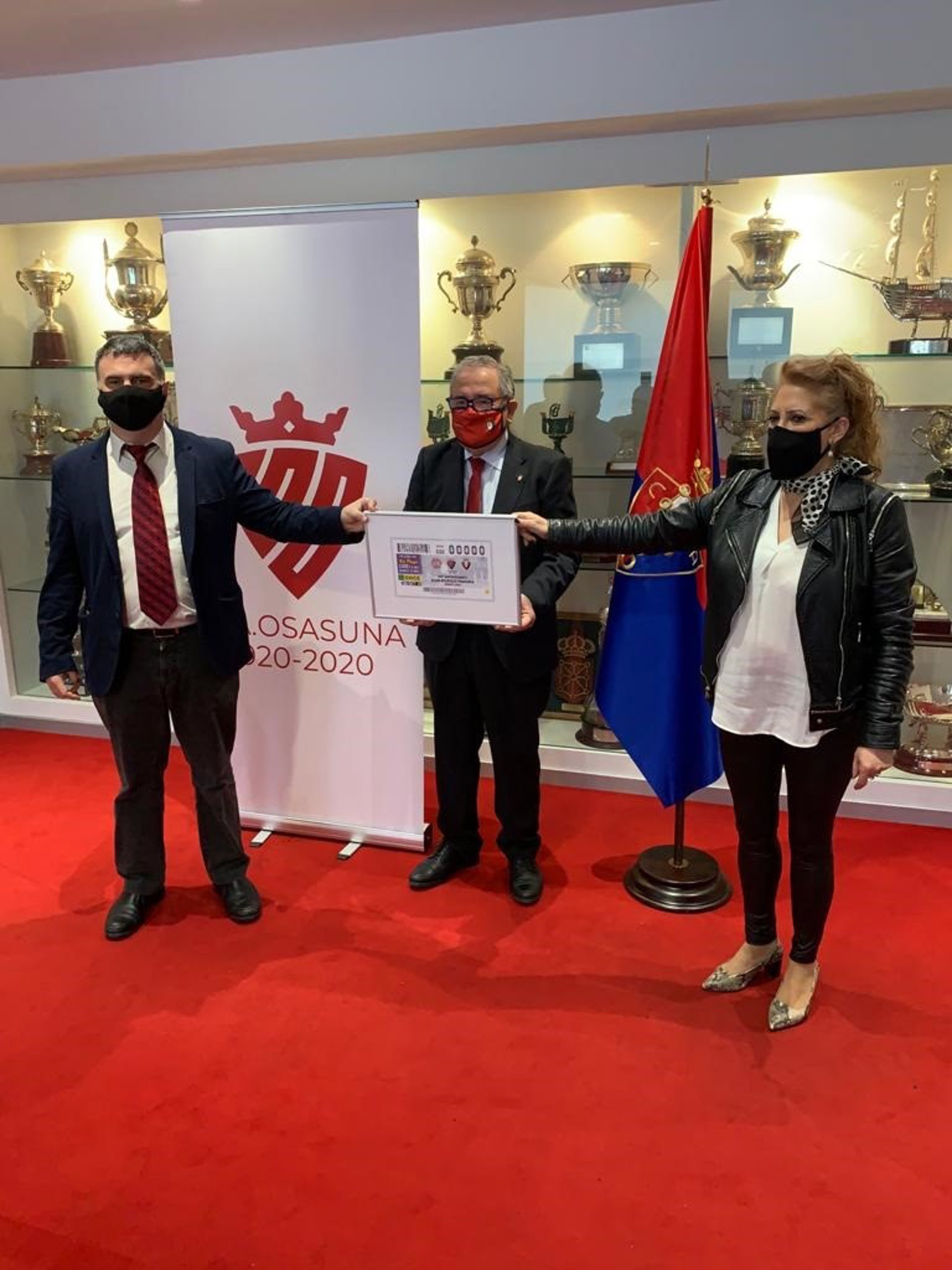 El Delegado Territorial de la ONCE en Navarra, Valentín Fortún Arriezu; la presidenta del Consejo Territorial de la ONCE en Navarra, Pilar Herrero Jiménez; y el presidente de Osasuna, Luis Sabalza, han presentado el cupón.