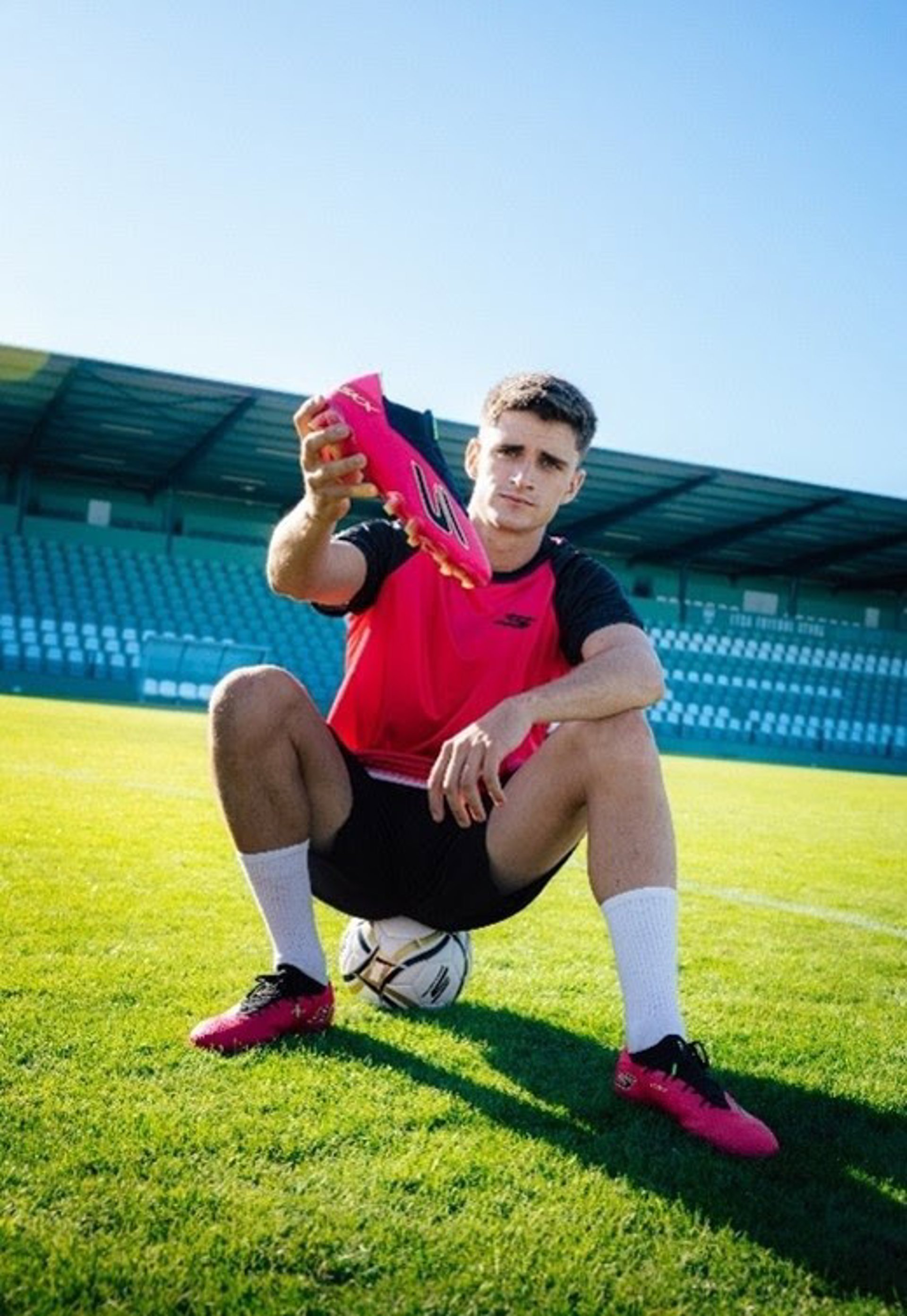 Skechers Football ofrece una gama completa de modelos para cada tipo de jugador y superficie, incluyendo el nuevo Flair Pack en color rosa, un diseño para Víctor, ya que los colores de su equipo combinan blanco y rojo.