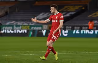 15 March 2021, United Kingdom, Wolverhampton: Liverpool's Diogo Jota celebrates scoring his side's first goal during the English Premier League soccer match between Wolverhampton Wanderers and Liverpool at Molineux Stadium. Photo: Paul Ellis/PA Wire/dpa