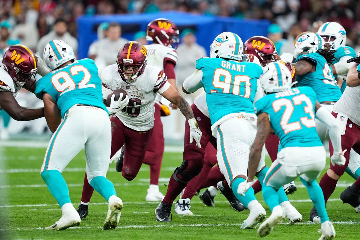 El choque en Madrid tan sólo tuvo dos 'touchdowns', pese a las innumerables y buenas oportunidades que hubo, con el resto de los puntos anotados por los 'kickers', y dentro del poco brillo, el 'running back' de los Dolphins De'Von Achane y el 'wide receiver' de los Commanders Deebo Samuel, fueron los más destacados en un partido que tuvieron en su mano ambas franquicias. La de Miami respira con su segunda victoria seguida para ponerse 4-7, mientras que la capitalina encajó su sexta derrota seguida y se queda con un preocupante 3-8.