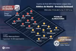 Infografía con posibles alineaciones del Atlético de Madrid y el Borussia Dortmund en el próximo partido que disputarán el 10 de abril de 2024 en la fase de cuartos de final de la UEFA Champions League 2023/2024 (Ida).