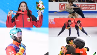 Los 'riders' Queralt Castellet y Lucas Eguibar (a la izquierda); los patinadores sobre hielo Olivia Smart y Tim Dieck; los patinadores de velocidad Nil Llop y Daniel Milagros; y los esquiadores Oriol Cardona y Ana Alonso abrazándose.