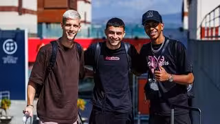 Los jugadores internacionales españoles Dani Olmo, Pedri y Lamine Yamal a su llegada a la concentración de la selección española en Las Rozas. - RFEF
