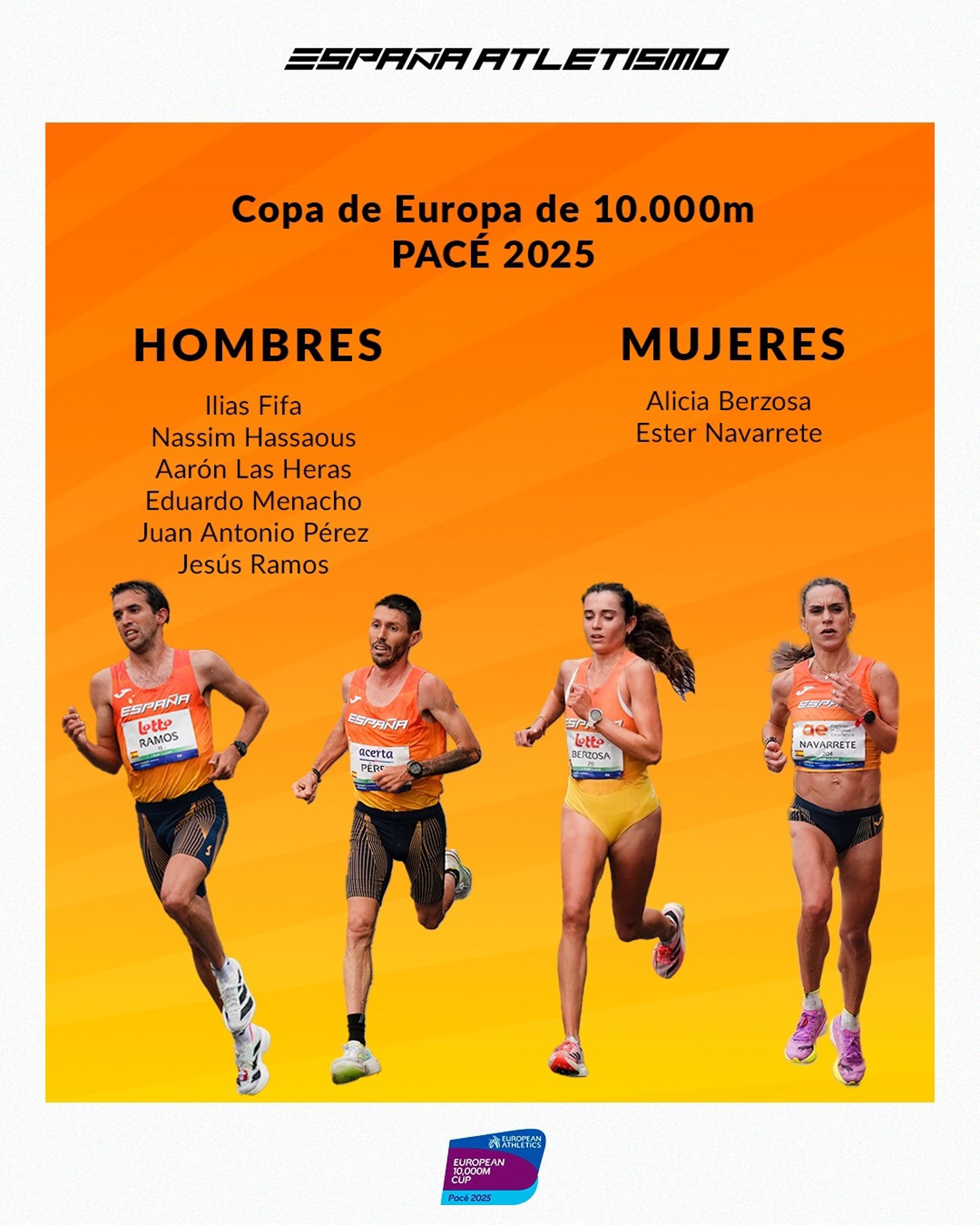 Los atletas Ilias Fifa, Hassim Hassaous, Aarón Las Heras, Eduardo Menacho, Juan Antonio Pérez, Jesús Ramos, Alicia Berzosa y Ester Navarrete integrarán el equipo español en la 27ª edición de la Copa de Europa de 10.000 metros, que se celebrará el sábado 24 de mayo en la localidad francesa de Pacé.