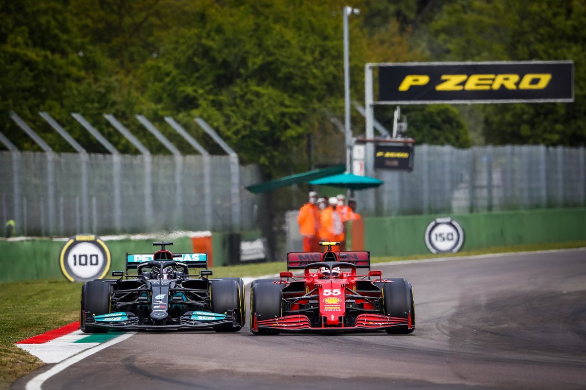 Archivo - 44 HAMILTON Lewis (gbr), Mercedes AMG F1 GP W12 E Performance, 55 SAINZ Carlos (spa), Scuderia Ferrari SF21, action during the Formula 1 Pirelli Gran Premio Del Made In Italy E Dell emilia Romagna 2021 from April 16 to 18, 2021 on the Autodrom