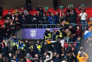 12 October 2021, United Kingdom, London: Hungary fans clash with police officers in the stands during the 2022 FIFA World Cup European Qualification Group I soccer match between England and Hungary at Wembley Stadium. Photo: Nick Potts/PA Wire/dpa