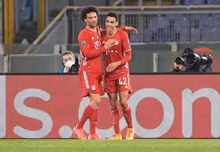 23 February 2021, Italy, Rome: Munich's Jamal Musiala (R) celebrates with team mate Leroy Sane after scoring their side's second goal during the UEFAChampions League round of 16 first leg soccer match between SS Lazio and FC Bayern Munich at the Olympi - Giuseppe Maffia/dpa
