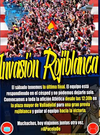 El Frente Atlético, con el lema '#APucelaOE' anima a los aficionados rojiblancos a acompañarles desde las 12.30 horas en la Plaza Mayor de Valladolid "para una gran previa y guiar al equipo hacia la victoria".