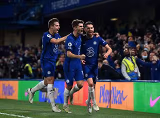 18 May 2021, United Kingdom, London: Chelsea's Jorginho (R) celebrates scoring his side's second goal during the English Premier League soccer match between Chelsea and Leicester City at Stamford Bridge. Photo: Glyn Kirk/PA Wire/dpa - Glyn Kirk/PA Wire/dpa