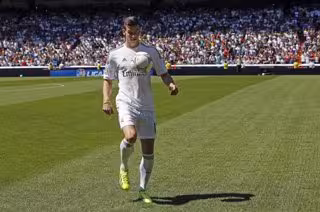 El futbolista galés Gareth Bale controla la pelota durante su presentación como