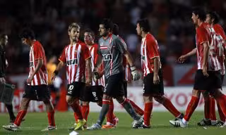 Players of Argentina's Estudiantes de La Plata leave the field at the end of the