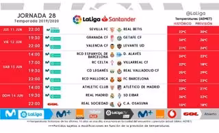 LaLiga ha anunciado dos cambios de horarios en los partidos de la jornada 28 de Primera División, la primera que se disputará después del confinamiento la próxima semana.