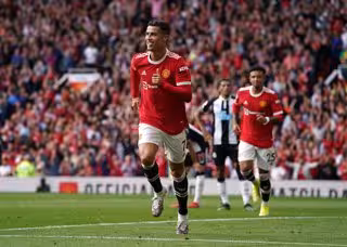 11 September 2021, United Kingdom, Manchester: Manchester United's Cristiano Ronaldo celebrates scoring his side's first goal during the English Premier League soccer match between Manchester United and Newcastle United at Old Trafford. Photo: Martin Ri - Martin Rickett/PA Wire/dpa