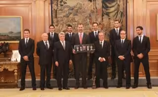 En el Palacio, el Atlético quiso entregar al Príncipe Felipe una pequeña réplica de los últimos trofeos conquistados, los dos títulos de Europa League, las dos Supercopas de Europa y la última Copa del Rey conquistada en el Santiago Bernabéu ante el Real Madrid.