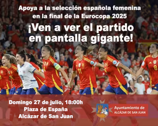 A las 18.00 horas, se podrá seguir en directo la retransmisión de la final de la Eurocopa Femenina 2025 entre España e Inglaterra en una pantalla gigante de 5x3 metros instalada frente a las puertas del Ayuntamiento.