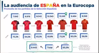 Los partidos de la Selección Española de fútbol en la Eurocopa registraron un promedio del 58,6% de cuota de pantalla, con una audiencia media de 8.346.000 espectadores. Cerca de 30 millones de personas han contactado con alguno de los partidos del equipo nacional en Telecinco, que representa el 64% de la población, según Barlovento en base a datos de Kantar Media.
