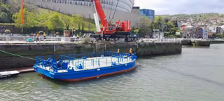 Tras una hora de maniobras con una grúa de gran tonelaje para sacar a la gabarra del dique del Museo Marítimo de Bilbao, la embarcación, de apenas 80 toneladas, 18,5 metros de eslora, 8,5 metros de manga y muy poco calado, flota desde la una de esta tarde en la Ría, a la espera de ser remolcada hasta el Puerto, de donde partirá este jueves hacia Bilbao con los jugadores rojiblancos y la Copa.