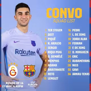 La lista de convocados para la 'final' en Estambul está integrada por Ter Stegen, Dest, Piqué, Araujo, Sergio Busquets, Riqui Puig, Dembélé, Memphis, Adama, Braithwaite, Neto, Lenglet, Pedri, L. De Jong, Jordi Alba, Ferran, F. De Jong, Mingueza, Eric, Aubameyang, Nico, Gavi y Arnau Tenas.