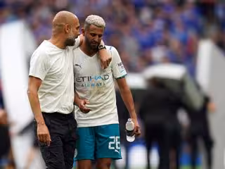 07 August 2021, United Kingdom, London: Manchester City manager Pep Guardiola (L)speaks with Riyad Mahrez after the English FA Community Shield soccer match between Leicester City and Manchester City at Wembley Stadium. Photo: Nick Potts/PA Wire/dpa
