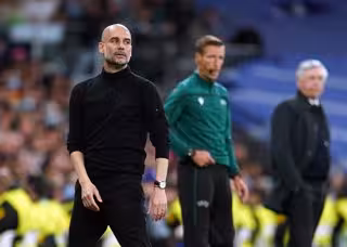 04 May 2022, Spain, Madrid: Manchester City manager Pep Guardiola (L) reacts from the touchlines during the UEFA Champions League semi final, second leg soccer match between Real Madrid and Manchester City at the Santiago Bernabeu. Photo: Nick Potts/PA