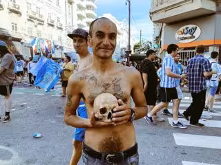 Este aficionado, identificado como Gabriel Aranda, hincha de 'La Academia' no quiso que su abuelo se perdiera el éxito de su equipo, a pesar de que está muerto. Es por ello que desenterró el cráneo de la tumba y se lo llevó al partido.