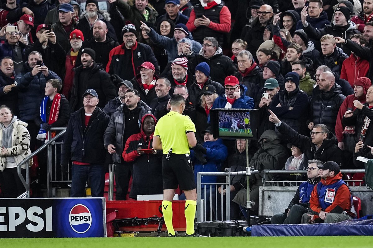 Archivo - Istvan Kovacs, referee of the match, revise the VAR system during the UEFA Champions League 2025/26 League Phase MD4 match between Liverpool FC and Real Madrid CF at Anfield on November 04, 2025 in Liverpool, England. - Dennis Agyeman / AFP7 / Europa Press - Archivo