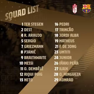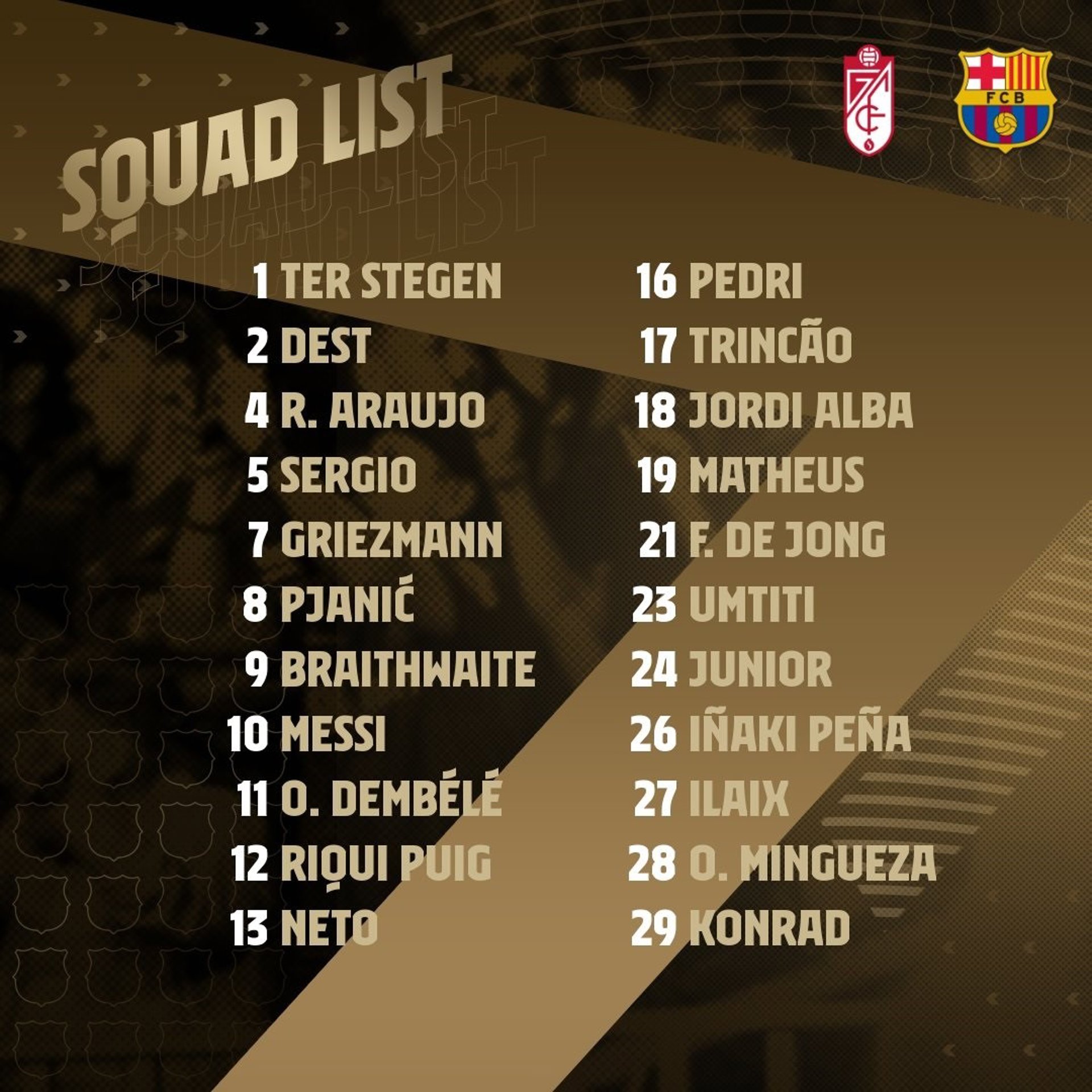 La lista es la siguiente: Ter Stegen, Dest, Araujo, Sergio, Griezmann, Pjanic, Braithwaite, Messi, Dembélé, Riqui Puig, Neto, Pedri, Trincao, Jordi Alba, Matheus, De Jong, Umtiti, Junior, Iñaki Peña, Ilaix, Mingueza y Konrad.
