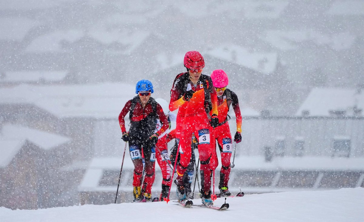 19 February 2026, Italy, Bormio: (L-R) Cidan Yuzhen of Team China, Ana Alonso Rodriguez of Team Spain and Maria Costa Diez of Team Spain compete on the ascent during the women's sprint qualification in ski mountaineering at the Milano Cortina 2026 Winter - Michael Kappeler/dpa
